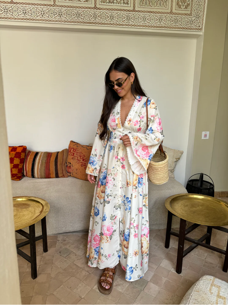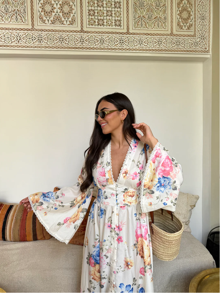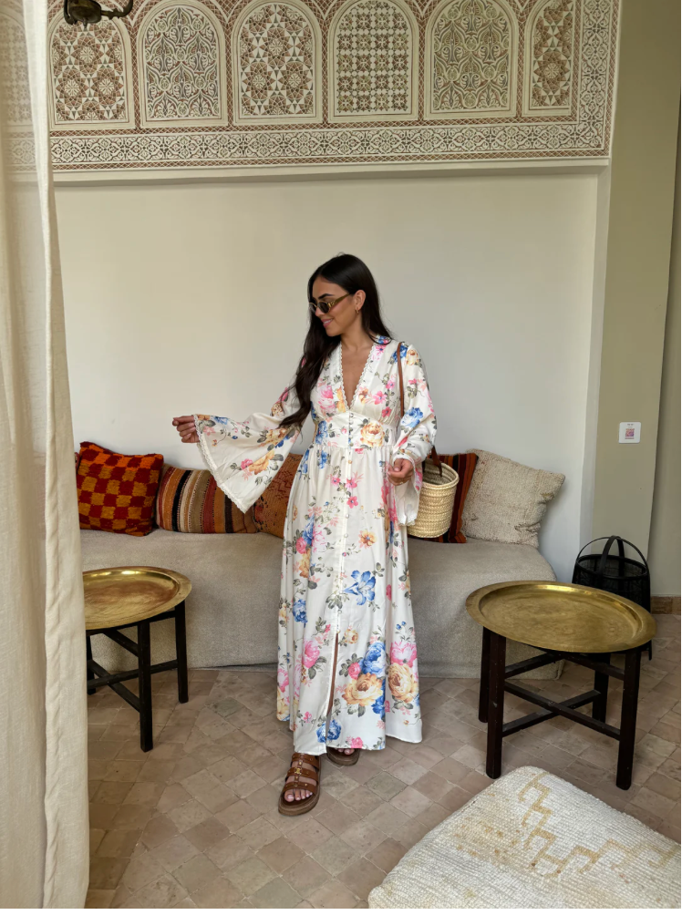 Dompel jezelf onder in een wereld van zachtheid en elegantie met onze Evelina™ | Eeuwige Bloemenjurk. Deze lange jurk is een ware ode aan de vrouwelijkheid, versierd met een adembenemend bloemenpatroon dat de tijdloze schoonheid van bloeiende tuinen oproept. De diepe V-hals en de belvormige mouwen geven een chique boheemse uitstraling, terwijl de vloeiende snit en de getailleerde taille alle silhouetten flatteren.